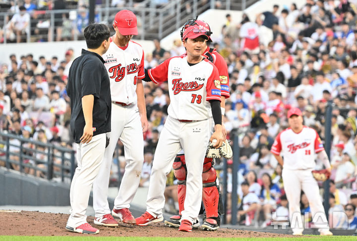 [광주=뉴시스] 변재훈 기자 = 11일 오후 광주 북구 광주-기아챔피언스필드에서 열린 프로야구 KIA 타이거즈 대 삼성 라이온즈의 경기, 4회초 3대4로 지고 있는 상황에서 KIA 선발 라우어가 강판되고 있다. 2024.08.11. [email protected]