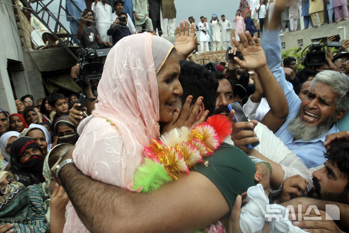 [미안 찬누=AP/뉴시스] 2024 파리올림픽 육상 남자 창 던지기 금메달리스트 아르샤드 나딤(오른쪽)이 11일(현지시각) 고향인 파키스탄 펀자브주 카네왈 지구 미안 찬누에 도착해 어머니와 포옹하고 있다. 나딤은 창 던지기 결선에서 92m97을 기록해 올림픽 신기록을 작성하며 파키스탄에 40년 만에 금메달을 안겼다. 2024.08.12.