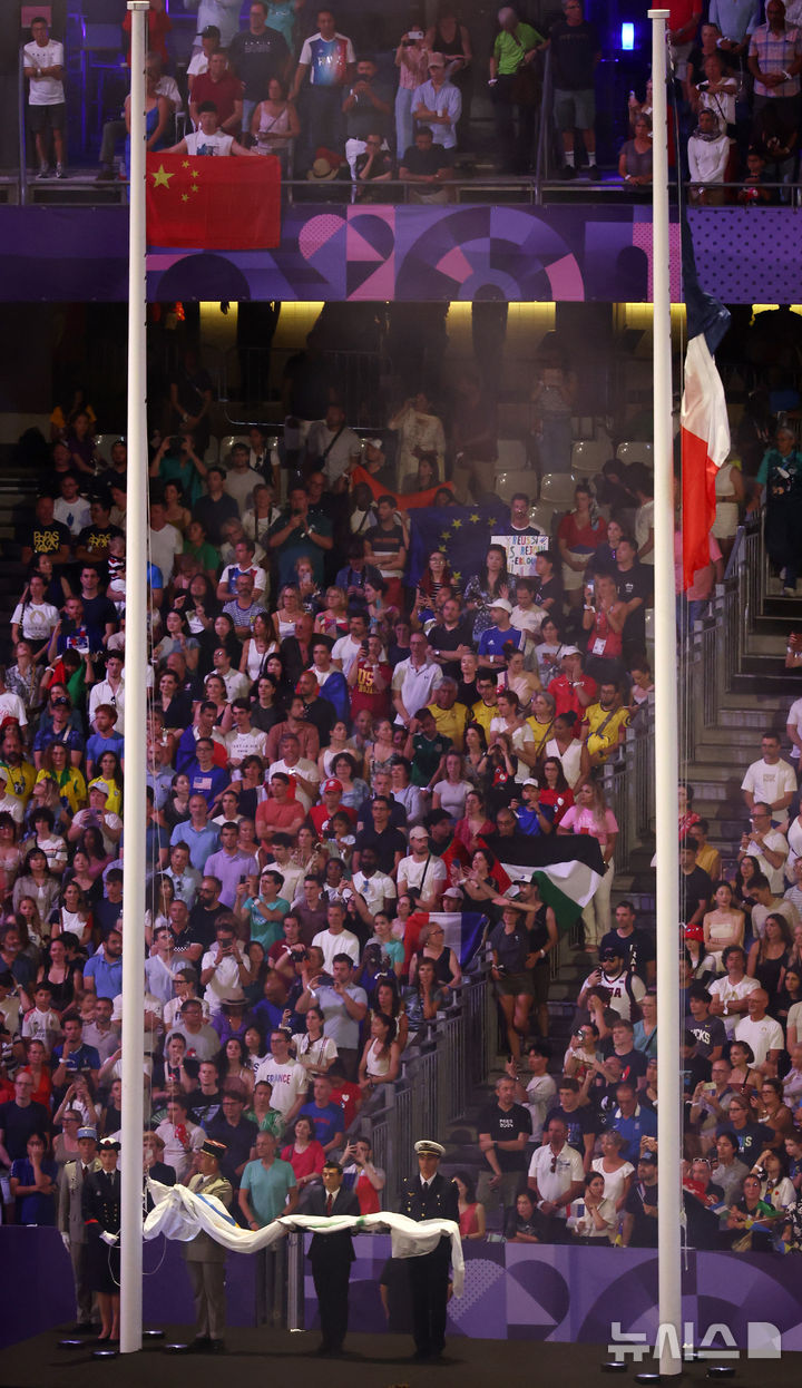 [생드니=뉴시스] 최동준 기자 = 11일(현지시각) 프랑스 생드니 스타드 드 프랑스에서 열린 2024 파리 올림픽 폐회식에서 올림픽기가 게양대에서 내려지고 있다. (공동취재) 2024.08.12. [email protected]
