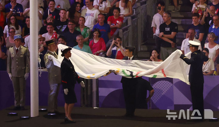 [생드니=뉴시스] 최동준 기자 = 11일(현지시각) 프랑스 생드니 스타드 드 프랑스에서 열린 2024 파리 올림픽 폐회식에서 올림픽기가 게양대에서 내려지고 있다. (공동취재) 2024.08.12. [email protected]