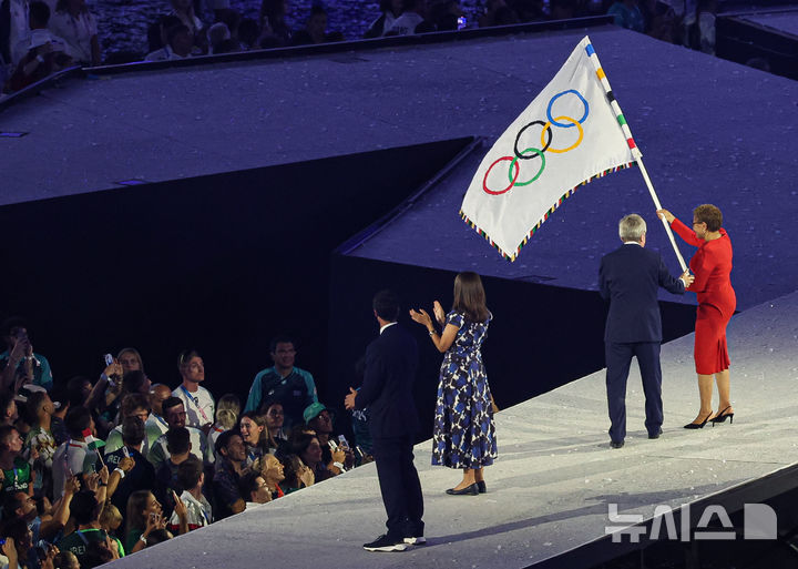 [생드니=뉴시스] 최동준 기자 = 11일(현지시각) 프랑스 생드니 스타드 드 프랑스에서 열린 2024 파리 올림픽 폐회식에서 캐런 배스 로스엔젤레스 시장이 토마스 바흐 IOC 위원장에게 대회기를 전달 받고 있다. (공동취재) 2024.08.12. [email protected]