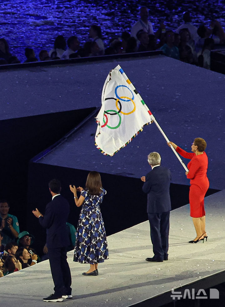[생드니=뉴시스] 최동준 기자 = 11일(현지시각) 프랑스 생드니 스타드 드 프랑스에서 열린 2024 파리 올림픽 폐회식에서 캐런 배스 로스엔젤레스 시장이 토마스 바흐 IOC 위원장에게 대회기를 전달 받고 있다. (공동취재) 2024.08.12. [email protected]