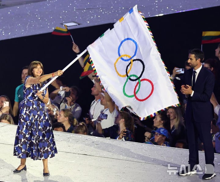 [생드니=뉴시스] 최동준 기자 = 11일(현지시각) 프랑스 생드니 스타드 드 프랑스에서 열린 2024 파리 올림픽 폐회식에서 안 이달고 프랑스 파리 시장이 대회기를 흔들고 있다. (공동취재) 2024.08.12. [email protected]