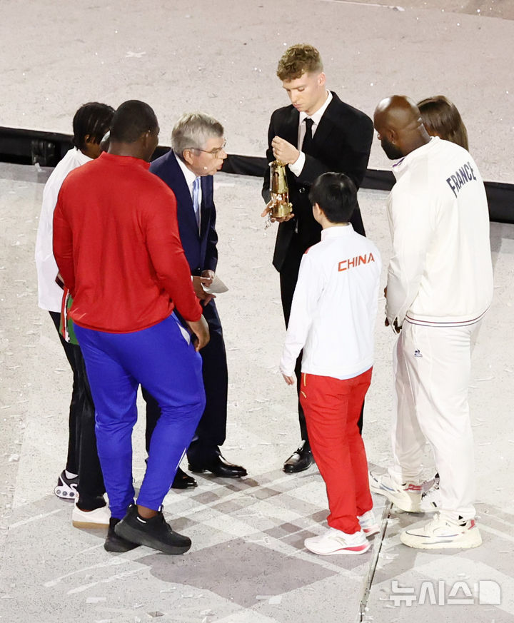 [생드니=뉴시스] 최동준 기자 = 11일(현지시각) 프랑스 생드니 스타드 드 프랑스에서 열린 2024 파리 올림픽 폐회식에서 토마스 바흐 IOC 위원장, 수영 4관왕 프랑스 레옹 마르샹 등 선수들이 성화를 소화하고 있다. (공동취재) 2024.08.12. [email protected]