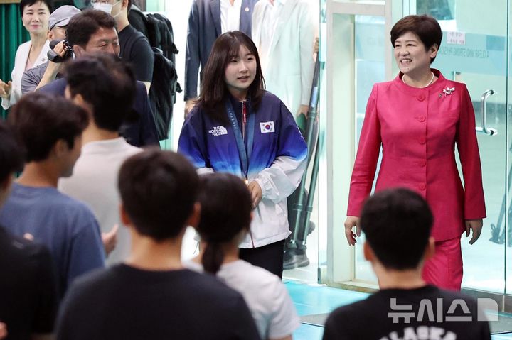 [대구=뉴시스] 이무열 기자 = 2024 파리 올림픽 한국 사격 국가대표 반효진이 12일 오전 대구 북구 대구체육고등학교 필승관에서 열린 ‘파리올림픽 신기록 수립 및 100번째 금메달 획득 기념 환영식’에 입장하고 있다. 2024.08.12. [email protected]
