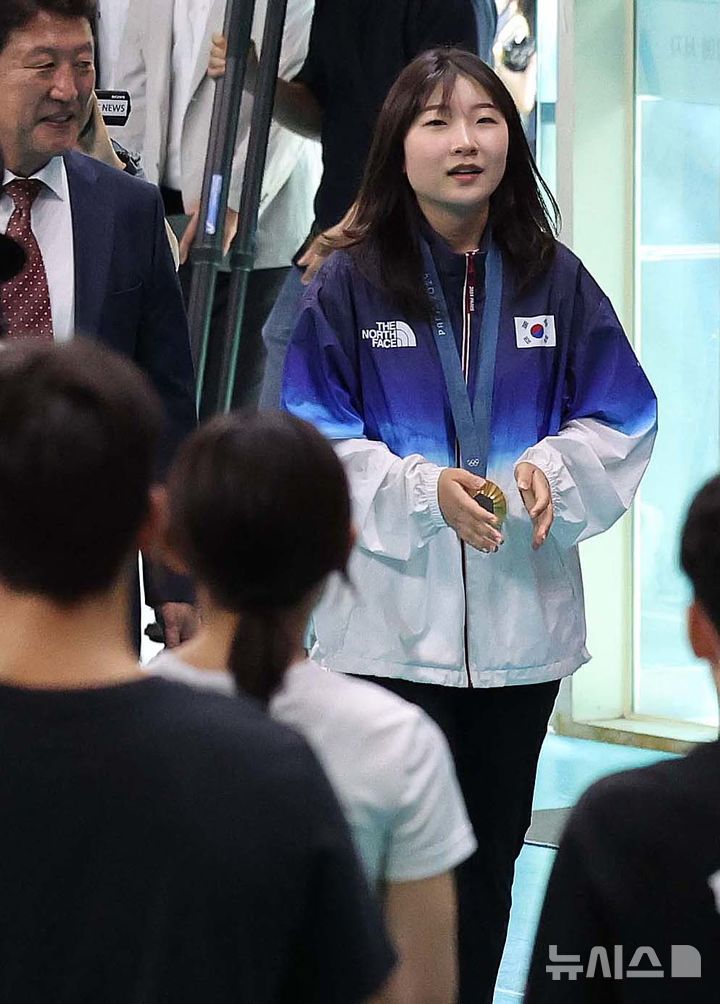 [대구=뉴시스] 이무열 기자 = 2024 파리 올림픽 한국 사격 국가대표 반효진이 12일 오전 대구 북구 대구체육고등학교 필승관에서 열린 ‘파리올림픽 신기록 수립 및 100번째 금메달 획득 기념 환영식’에 입장하고 있다. 2024.08.12. [email protected]
