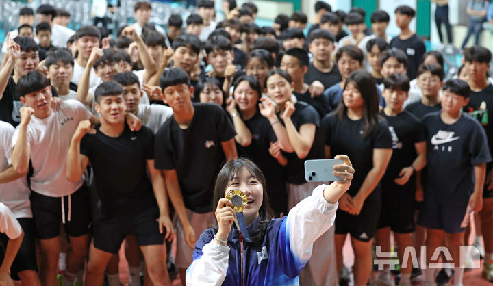 [대구=뉴시스] 이무열 기자 = 2024 파리 올림픽 한국 사격 국가대표 반효진이 12일 오전 대구 북구 대구체육고등학교 필승관에서 열린 ‘파리올림픽 신기록 수립 및 100번째 금메달 획득 기념 환영식’에서 재학생들과 셀카를 찍고 있다. 2024.08.12. [email protected]