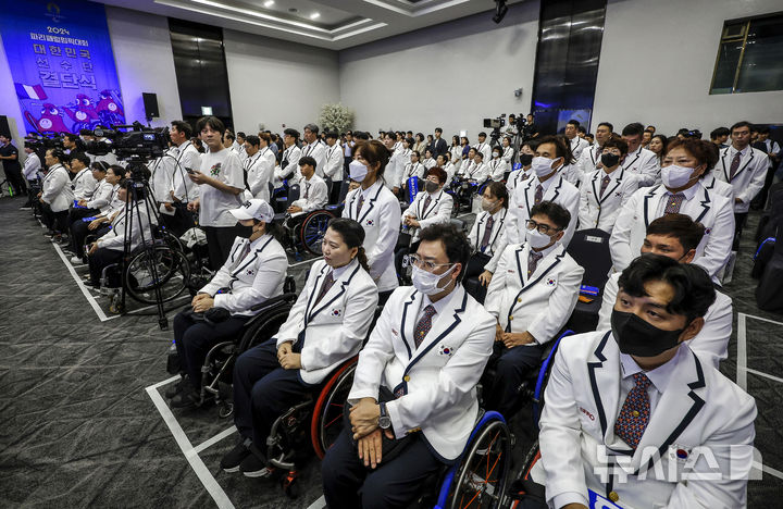 [서울=뉴시스] 정병혁 기자 = 12일 서울 송파구 올림픽파크텔에서 열린 2024 파리 패럴림픽대회 대한민국 선수단 결단식에 대한민국 선수단이 참석해 있다. 2024.08.12. [email protected]