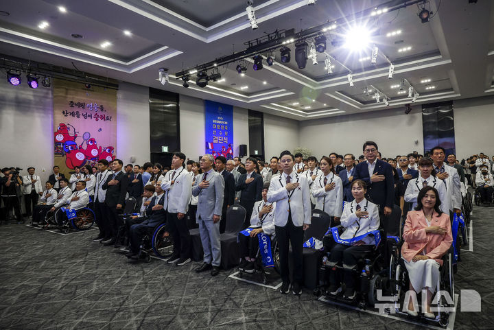 [서울=뉴시스] 정병혁 기자 = 12일 서울 송파구 올림픽파크텔에서 열린 2024 파리 패럴림픽대회 대한민국 선수단 결단식에서 참석자들이 국민의례를 하고 있다. 2024.08.12. [email protected]