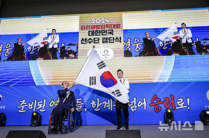 [서울=뉴시스] 정병혁 기자 = 정진완 대한장애인체육회장이 12일 서울 송파구 올림픽파크텔에서 열린 2024 파리 패럴림픽대회 대한민국 선수단 결단식에서 배동현 선수단장에게 단기를 전달하고 있다. 2024.08.12. [email protected]