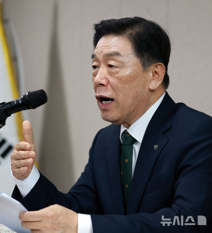 [서울=뉴시스] 고범준 기자 = 김형석 독립기념관장이 12일 서울 용산구 서울지방보훈청에서 광복절 경축식 취소 및 뉴라이트 성향 관련 기자회견을 하고 있다. 2024.08.12. [email protected]