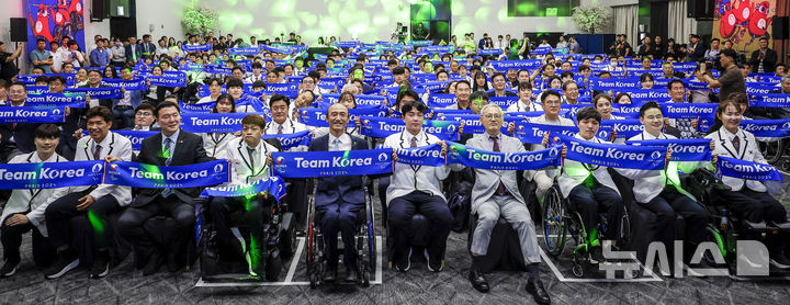 [서울=뉴시스] 정병혁 기자 = 12일 서울 송파구 올림픽파크텔에서 열린 2024 파리 패럴림픽대회 대한민국 선수단 결단식에서 선수단이 팀 코리아라고 적힌 머플러를 들고 기념촬영을 하고 있다. 2024.08.12. [email protected]