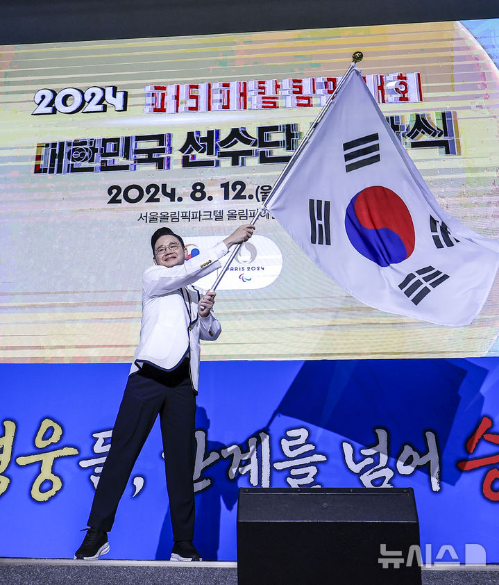 [서울=뉴시스] 정병혁 기자 = 배동현 2024 파리 패럴림픽대회 대한민국 선수단장이 12일 서울 송파구 올림픽파크텔에서 열린 2024 파리 패럴림픽대회 대한민국 선수단 결단식에서 단기를 흔들고 있다. 2024.08.12. [email protected]