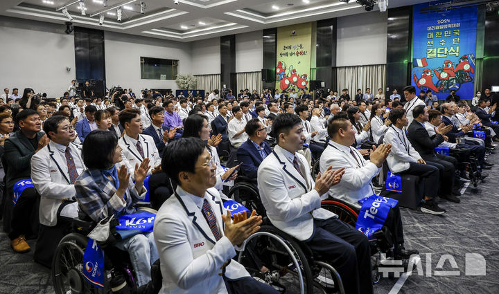 [서울=뉴시스] 정병혁 기자 = 12일 서울 송파구 올림픽파크텔에서 열린 2024 파리 패럴림픽대회 대한민국 선수단 결단식에 대한민국 선수단이 참석해 있다. 2024.08.12. [email protected]