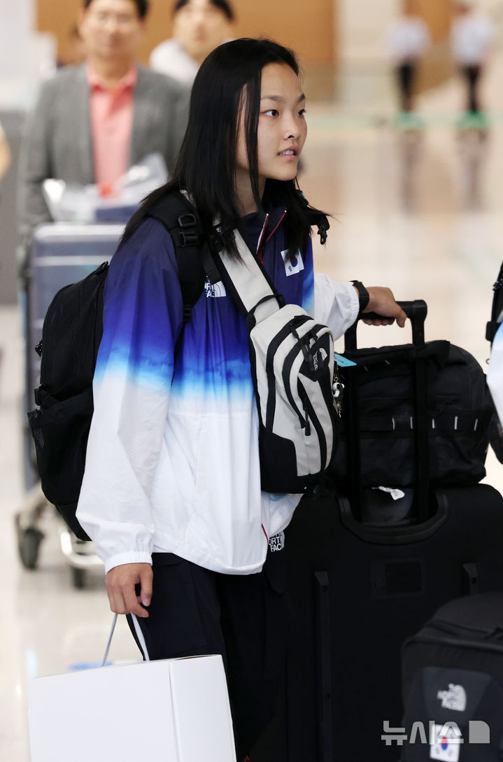 [인천공항=뉴시스] 홍효식 기자 = 파리올림픽 스포츠클라이밍 국가대표 서채현이 12일 오후 인천국제공항 제2여객터미널을 통해 귀국하고 있다. 2024.08.12. [email protected]