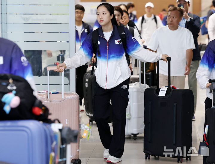 [인천공항=뉴시스] 홍효식 기자 = 2024 파리 올림픽 탁구 혼성 복식과 여자 단체에서 동메달을 획득한 신유빈 선수가 12일 오후 인천국제공항 제2여객터미널을 통해 귀국하고 있다. 2024.08.12. [email protected]