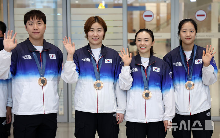 [인천공항=뉴시스] 홍효식 기자 = 2024 파리 올림픽 탁구에서 동메달을 획득한 임종훈(왼쪽부터), 이은혜, 전지희, 신유빈이 12일 오후 인천국제공항 제2여객터미널을 통해 귀국해 포즈를 취하고 있다. 2024.08.12. [email protected]