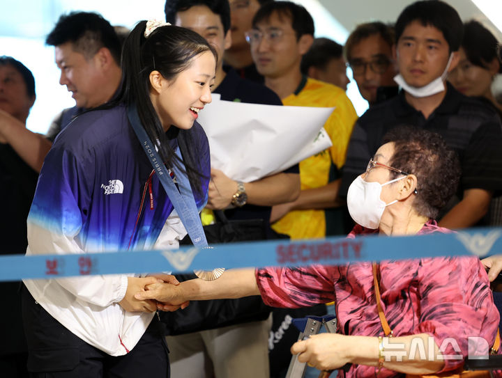[인천공항=뉴시스] 홍효식 기자 = 2024 파리 올림픽 탁구 혼성 복식과 여자 단체에서 동메달을 획득한 신유빈 선수가 12일 오후 인천국제공항 제2여객터미널을 통해 귀국해 오광헌 감독의 어머니와 인사를 나누고 있다. 2024.08.12. [email protected]