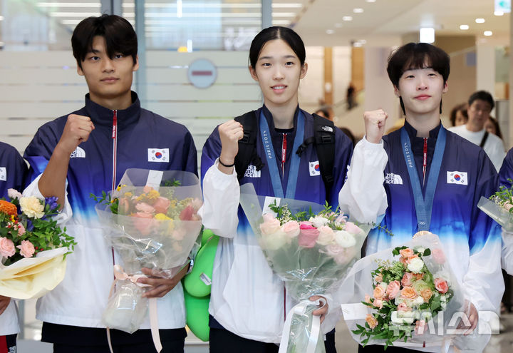 [인천공항=뉴시스] 홍효식 기자 = 2024 파리 올림픽 태권도 국가대표팀 서건우(왼쪽부터), 김유진, 이다빈 선수가 12일 오후 인천국제공항 제2여객터미널을 통해 귀국해 기념촬영하고 있다. 2024.08.12. [email protected]