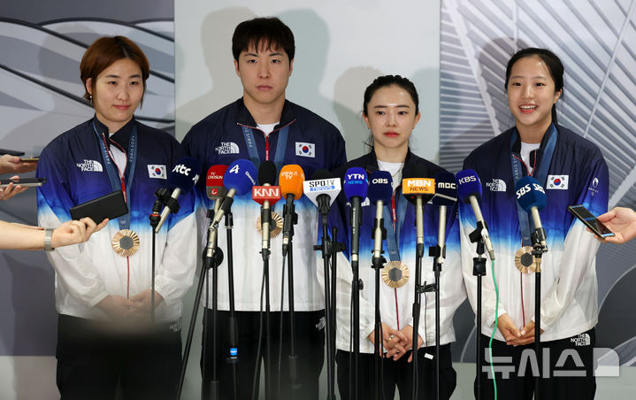 [인천공항=뉴시스] 홍효식 기자 = 2024 파리 올림픽 탁구에서 동메달을 획득한 신유빈(오른쪽부터), 전지희, 임종훈, 이은혜 선수가 12일 오후 인천국제공항 제2여객터미널을 통해 귀국한 뒤 취재진 질문에 답하고 있다. 2024.08.12. [email protected]