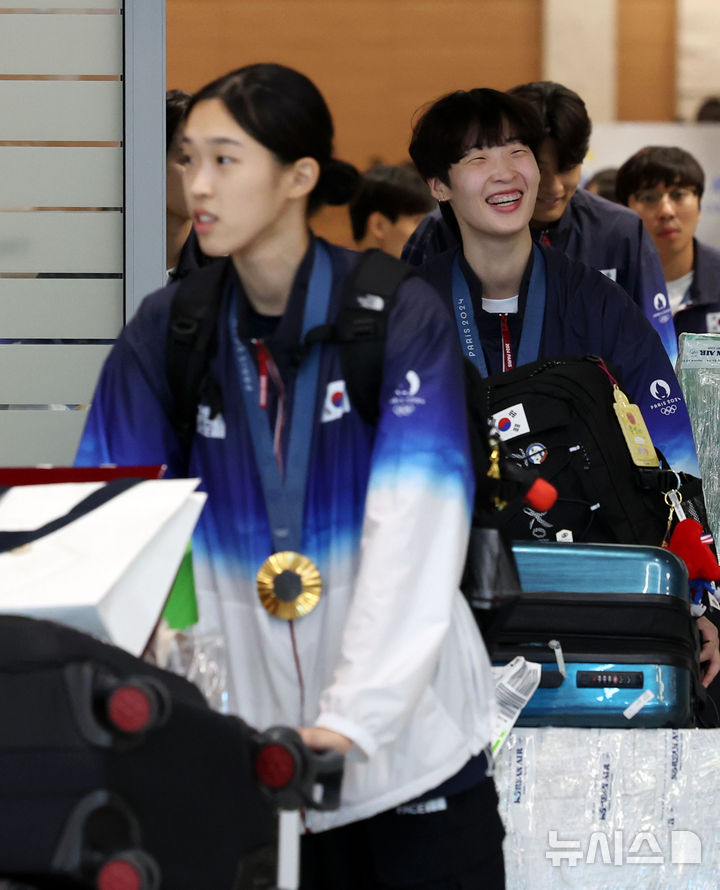 [인천공항=뉴시스] 홍효식 기자 = 2024 파리 올림픽 태권도 여자 57kg급에서 금메달을 획득한 김유진(왼쪽) 선수와 67kg급에서 동메달을 획득한 이다빈 선수가 12일 오후 인천국제공항 제2여객터미널을 통해 귀국하고 있다. 2024.08.12. [email protected]