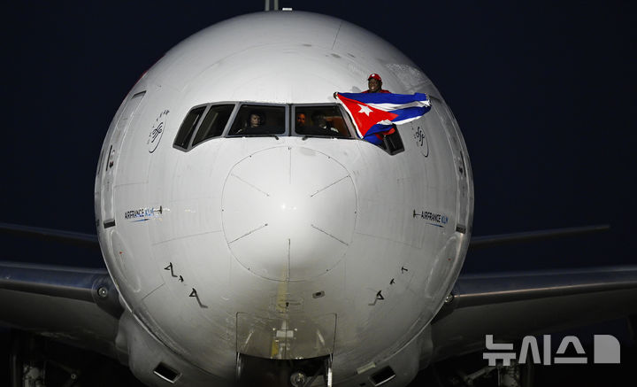 [아바나=AP/뉴시스] 쿠바 레슬링 영웅 미하인 로페즈가 12일(현지시각) 쿠바 아바나의 호세 마르티 공항에 도착해 비행기 조종석 창문에서 국기를 흔들고 있다. 로페즈는 2024 파리올림픽 레슬링에서 금메달을 따 올림픽 사상 처음으로 단일 종목 5연패의 위업을 달성했다. 2024.08.13.