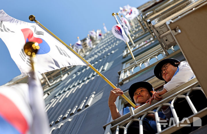 [대구=뉴시스] 이무열 기자 = 13일 대구 북구 동화훼밀리타운 아파트에서 열린 ‘광복 79주년 나라사랑 전 세대 태극기 달기 운동’에서 한국자유총연맹 대구북구지회 회원들이 태극기를 흔들고 있다. 2024.08.13. [email protected]
