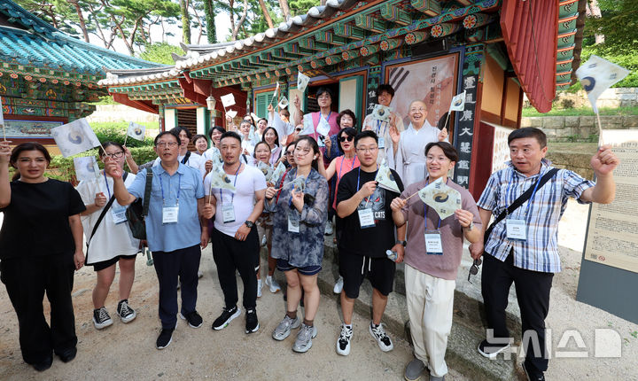 [서울=뉴시스] 이영환 기자 = 광복절을 맞아 국가보훈부에서 초청한 해외 거주 독립유공자 후손들이 13일 오후 서울 은평구 진관사 칠성각 앞에서 주지 법해스님, 총무 선우스님과 함께 진관사 태극기를 흔들고 있다. 2024.08.13. [email protected]