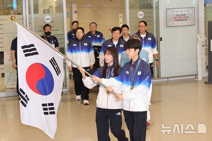 [인천공항=뉴시스] 황준선 기자 = 2024 파리올림픽에 출전한 대한민국 선수단 본진이 13일 오후 인천국제공항을 통해 귀국하고 있다. 2024.08.13. [email protected]