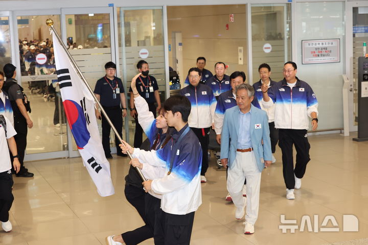 [인천공항=뉴시스] 황준선 기자 = 2024 파리올림픽에 출전한 대한민국 선수단 본진이 이기흥 대한체육회장 등과 함께 13일 오후 인천국제공항을 통해 귀국하고 있다. 2024.08.13. [email protected]
