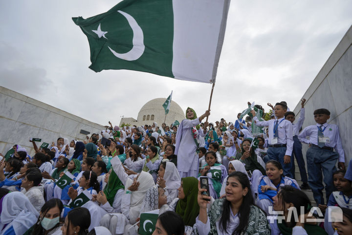 [카라치=AP/뉴시스] 14일(현지시각) 파키스탄 카라치에 있는 파키스탄 국부 '무함마드 알리 진나' 묘소에서 학생들이 제77주년 독립기념일을 축하하며 국기를 흔들고 있다. 2024.08.14.