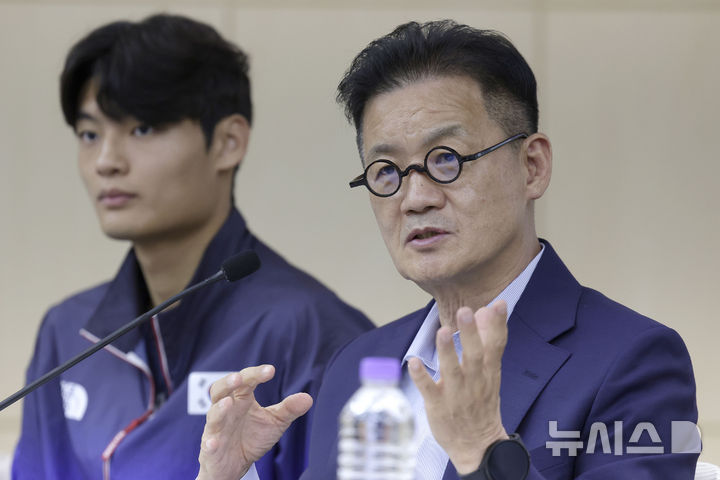 [서울=뉴시스] 최동준 기자 = 14일 서울 송파구 한국체육대학교에서 열린 파리 올림픽 메달리스트 기자간담회에서 장갑석 사격 지도교수가 취재진 질문에 답변하고 있다. 2024.08.14. [email protected]