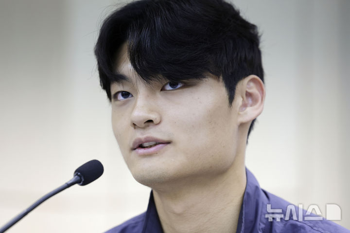 [서울=뉴시스] 최동준 기자 = 14일 서울 송파구 한국체육대학교에서 열린 파리 올림픽 메달리스트 기자간담회에서 태권도 서건우가 취재진 질문에 답변하고 있다. 2024.08.14. [email protected]