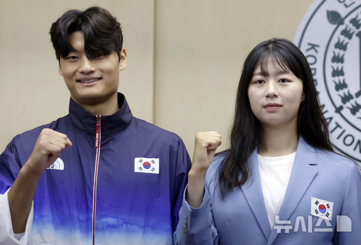 [서울=뉴시스] 최동준 기자 = 14일 서울 송파구 한국체육대학교에서 열린 파리 올림픽 메달리스트 기자간담회에서 양궁 임시현, 태권도 서건우가 기념촬영을 하고 있다. 2024.08.14. [email protected]