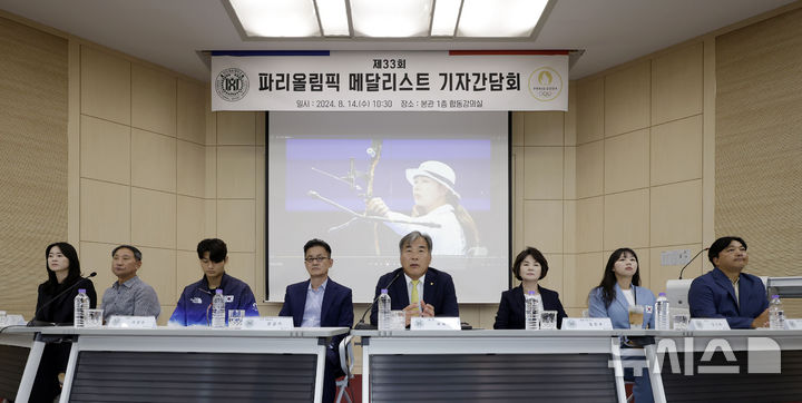 [서울=뉴시스] 최동준 기자 = 14일 서울 송파구 한국체육대학교에서 열린 파리 올림픽 메달리스트 기자간담회에서 문원재 총장이 인사말을 하고 있다. 2024.08.14. [email protected]