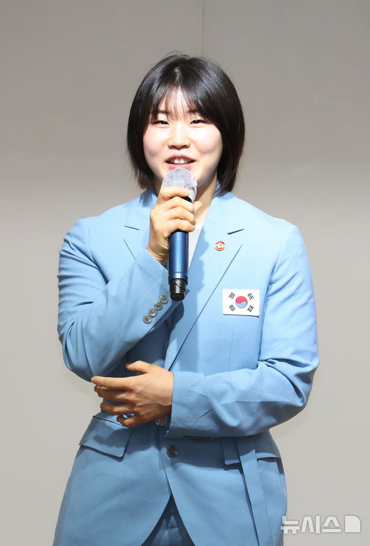 [서울=뉴시스] 고승민 기자 = 2024 파리올림픽에서 유도 은메달을 획득한 허미미가 14일 서울 여의도 광복회에서 열린 광복회 유족회원증 전달식에서 인사말을 하고 있다. 2024.08.14. [email protected]