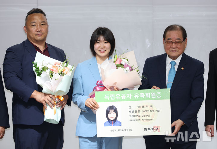 [서울=뉴시스] 고승민 기자 = 2024 파리올림픽에서 유도 은메달을 획득한 허미미가 14일 서울 여의도 광복회에서 열린 광복회 유족회원증 전달식에서 이종찬 광복회장으로부터 유족회원증을 전달받은 뒤 참석자들과 기념촬영을 하고 있다. 2024.08.14. [email protected]