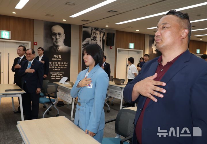 [서울=뉴시스] 고승민 기자 = 2024 파리올림픽에서 유도 은메달을 획득한 허미미가 14일 서울 여의도 광복회에서 열린 광복회 유족회원증 전달식에서 이종찬 광복회장 등 참석자들과 함께 국민의례를 하고 있다. 2024.08.14. [email protected]