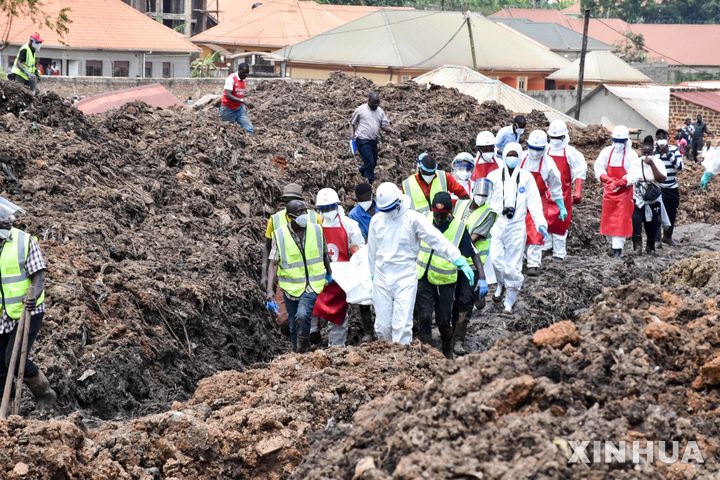 [캄팔라=신화/뉴시스] 14일(현지시각) 우간다 캄팔라 인근 키테지 쓰레기 매립장 붕괴 현장에서 보호장비를 착용한 구조대원들이 희생자 시신을 옮기고 있다. 현지 경찰 대변인은 이번 사태로 인한 사망자 숫자가 30명으로 늘었다고 밝혔다. 2024.08.15.