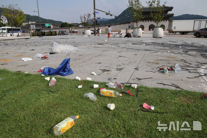 [서울=뉴시스] 배훈식 기자 = 제79주년 광복절인 15일 오전 서울 종로구 광화문광장에 전날 밤 열린 광복절 전야음악회 ‘8.15 서울 마이 소울(Seoul My Soul)’ 행사 쓰레기가 널려 있다. 2024.08.15. [email protected]