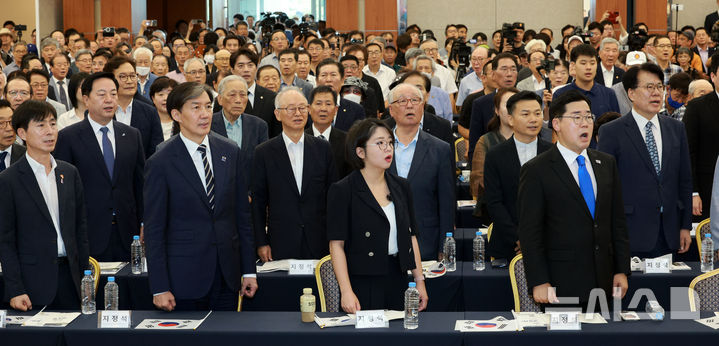 [서울=뉴시스] 고범준 기자 = 박찬대(앞줄 오른쪽부터) 더불어민주당 당대표 직무대행 겸 원내대표, 용혜인 기본소득당 대표, 조국 조국혁신당 대표 등이 15일 서울 용산구 백범김구기념관에서 광복회 주최로 열린 제79주년 광복절 기념식에서 애국가를 제창하고 있다. 2024.08.15. [email protected]