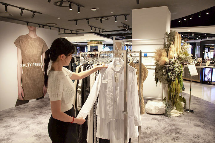 [서울=뉴시스] 황준선 기자 = 15일 서울 송파구 잠실 에비뉴엘 지하 1층 K패션 브랜드 연합 팝업스토어를 찾은 고객이 제품을 살펴보고 있다. 롯데백화점은 15일부터 오는 9월 1일까지 서울 송파구 잠실 롯데월드몰 지하1층에서 패션회사 ‘파인드폼’이 운영하는 세 브랜드 ‘오아이오아이 컬렉션’, ‘로우타이드’, ‘솔티페블‘의 연합 팝업행사를 진행한다. (사진=롯데쇼핑 제공) 2024.08.15. [email protected] *재판매 및 DB 금지