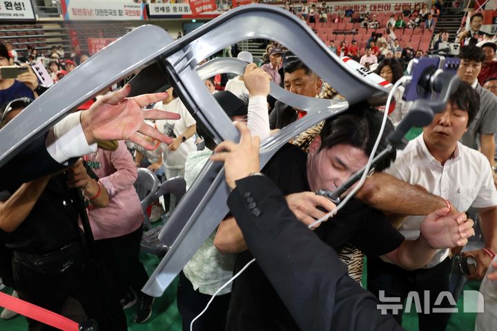 사진은 지난 7월 15일 충남 천안시 유관순체육관에서 열린 국민의힘 제4차 전당대회 대전·세종·충북·충남 합동연설회에서 참석자들 일부가 연설중인 한동훈 후보에게 '배신자'라고 외치며 의자를 집어 던지려고 하자 경호원과 당직자들이 제지하고 있는 모습. 2024.08.16. [email protected]