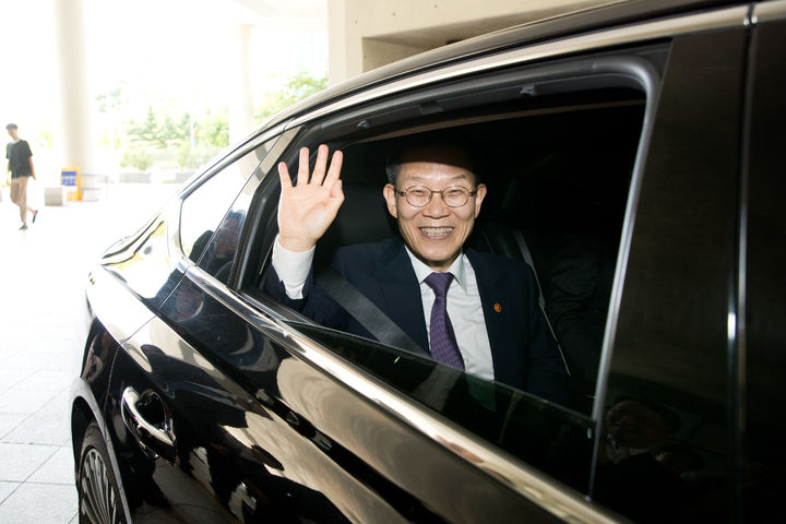 [서울=뉴시스] 김명년 기자 = 이종호 과학기술정보통신부 장관이 16일 오후 세종시 정부세종청사에서 이임식을 마친 뒤 청사를 떠나며 손을 흔들고 있다.(사진=과학기술정보통신부 제공) 2024.08.16. [email protected] *재판매 및 DB 금지