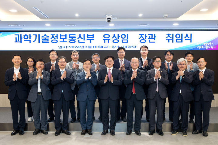 [서울=뉴시스] 김명년 기자 = 유상임 과학기술정보통신부 장관이 16일 오후 세종특별자치시 정부세종청사에서 취임식을 마치고 기념 촬영하고 있다. 앞줄 왼쪽부터 노경원 우주항공청 차장, 권석민 국립중앙과학관장, 윤영빈 우주항공청장, 강도현 제2차관, 유상임 장관, 이창윤 제1차관, 류광준 과학기술혁신본부장, 조해근 우정사업본부장, 김지수 지식재산전략기획단장, 뒷줄 왼쪽부터 한형주 국립과천과학관장, 임요업 과학기술혁신조정관, 송상훈 정보통신정책실장, 황판식 연구개발정책실장, 구혁채 기획조정실장, 류제명 네트워크정책실장, 이상훈 한국방송통신전파진흥원장, 김정삼 중앙전파관리소장.(사진=과학기술정보통신부 제공) 2024.08.16. [email protected] *재판매 및 DB 금지