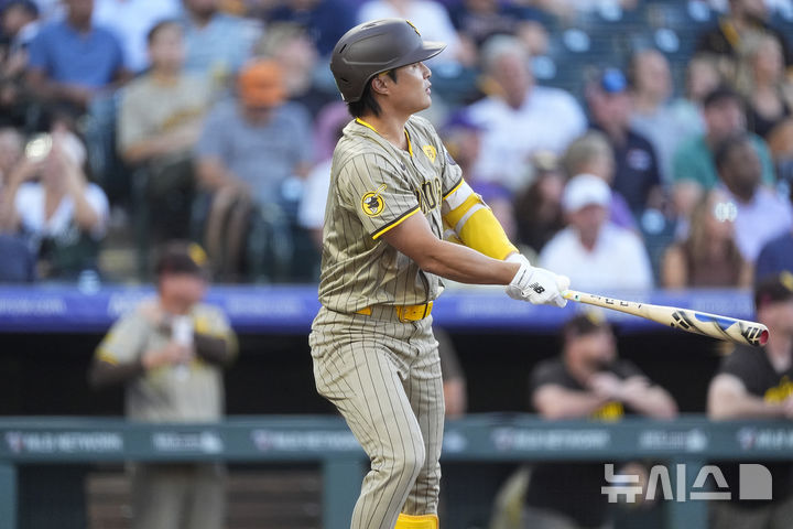 [덴버=AP/뉴시스] 샌디에이고 파드리스의 김하성이 16일(현지시각) 미 콜로라도주 덴버의 쿠어스 필드에서 열린 2024 메이저리그 콜로라도 로키스와 경기 2회 초 2점 홈런(시즌 11호)을 치고 타구를 바라보고 있다. 2024.08.17.