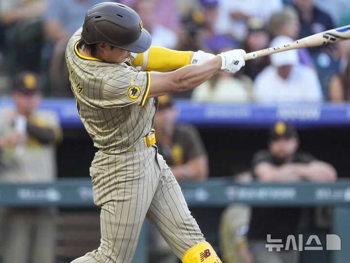 [덴버=AP/뉴시스] 샌디에이고 파드리스의 김하성이 16일(현지시각) 미 콜로라도주 덴버의 쿠어스 필드에서 열린 2024 메이저리그 콜로라도 로키스와 경기 2회 초 2점 홈런(시즌 11호)을 치고 있다. 2024.08.17.