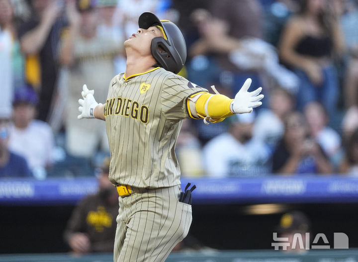 [덴버=AP/뉴시스] 샌디에이고 파드리스의 김하성이 16일(현지시각) 미 콜로라도주 덴버의 쿠어스 필드에서 열린 2024 메이저리그 콜로라도 로키스와 경기 2회 초 2점 홈런(시즌 11호)을 친 후 홈에 들어오며 세리머니하고 있다. 2024.08.17.
