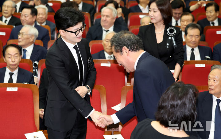 [서울=뉴시스] 추상철 기자 = 한동훈 국민의힘 대표와 이낙연 전 국무총리가 18일 오전 서울 동작구 국립서울현충원 현충관에서 열린 '김대중 전 대통령 서거 15주기 추도식'에서 인사하고 있다. 2024.08.18. [email protected]