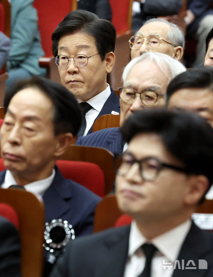 [서울=뉴시스] 추상철 기자 = 한동훈 국민의힘 대표와 이재명 더불어민주당 당 대표 후보가 18일 오전 서울 동작구 국립서울현충원 현충관에서 열린 '김대중 전 대통령 서거 15주기 추도식'에 참석해 있다. 2024.08.18. [email protected]